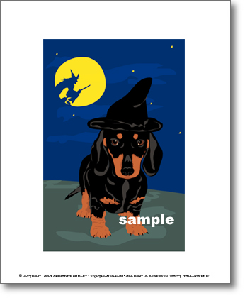 This black/tan dachshund puppy is dressed up for Halloween in a witch's hat. Dachshunds generally don't like to dress up but this agreeable pup seems willing to go along... at least for now.