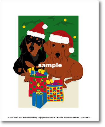 These two doxies have been busy helping Santa wrap Christmas gifts, and they managed to keep their hats on while doing it!